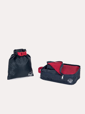 The four-piece Standard Issue Travel Organizer set is perfect for storing and separating garments within your luggage. It includes three uniquely sized packing cubes and a coated ripstop roll-bag for wet items.